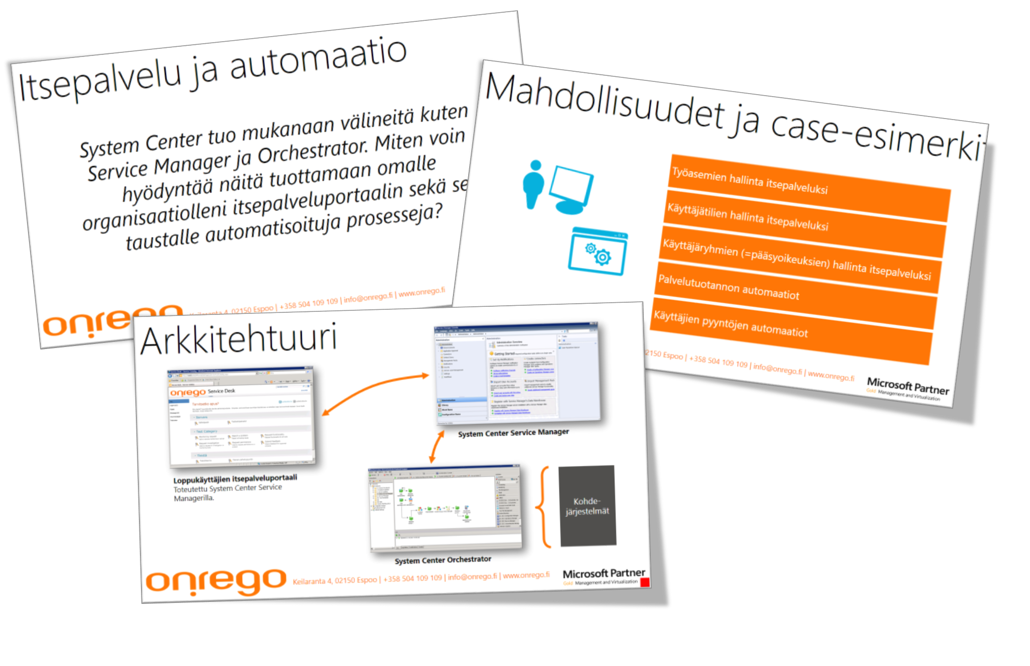 On the tour, Onrego’s presentation is about implementing self-service and automation using System Center Service Manager and System Center Orchestrator with half a dozen case examples of what Onrego has already implemented to its customers both as a cloud service (Onrego Online System Center) and as on-premises.
